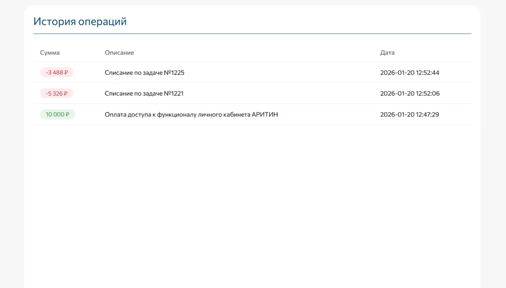 Следите за статусом, историей операций и списаниями в реальном времени.