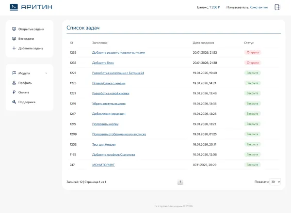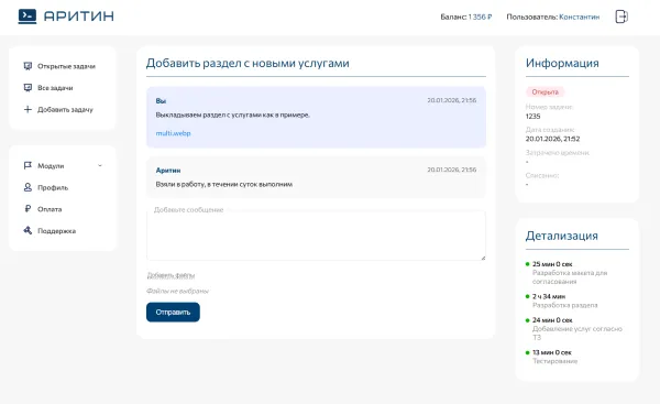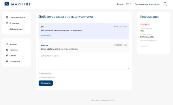Забудьте о поиске исполнителей и неразберихе в почте. Наш сервис — это единая платформа для профессиональной технической поддержки ваших сайтов. Зарегистрируйтесь, создавайте заявки на любые задачи и получайте быстрые решения. Вы всегда в курсе статусов работ, истории обслуживания и контролируете бюджет.